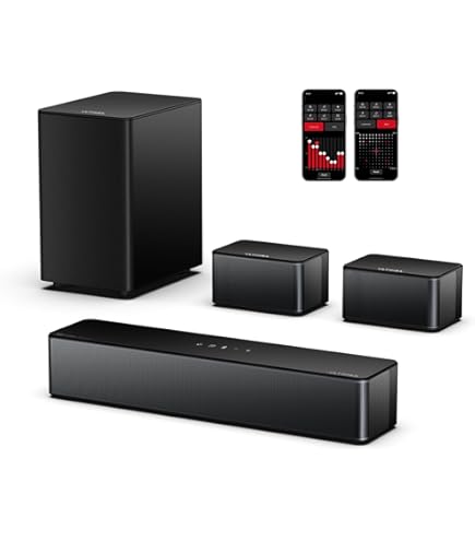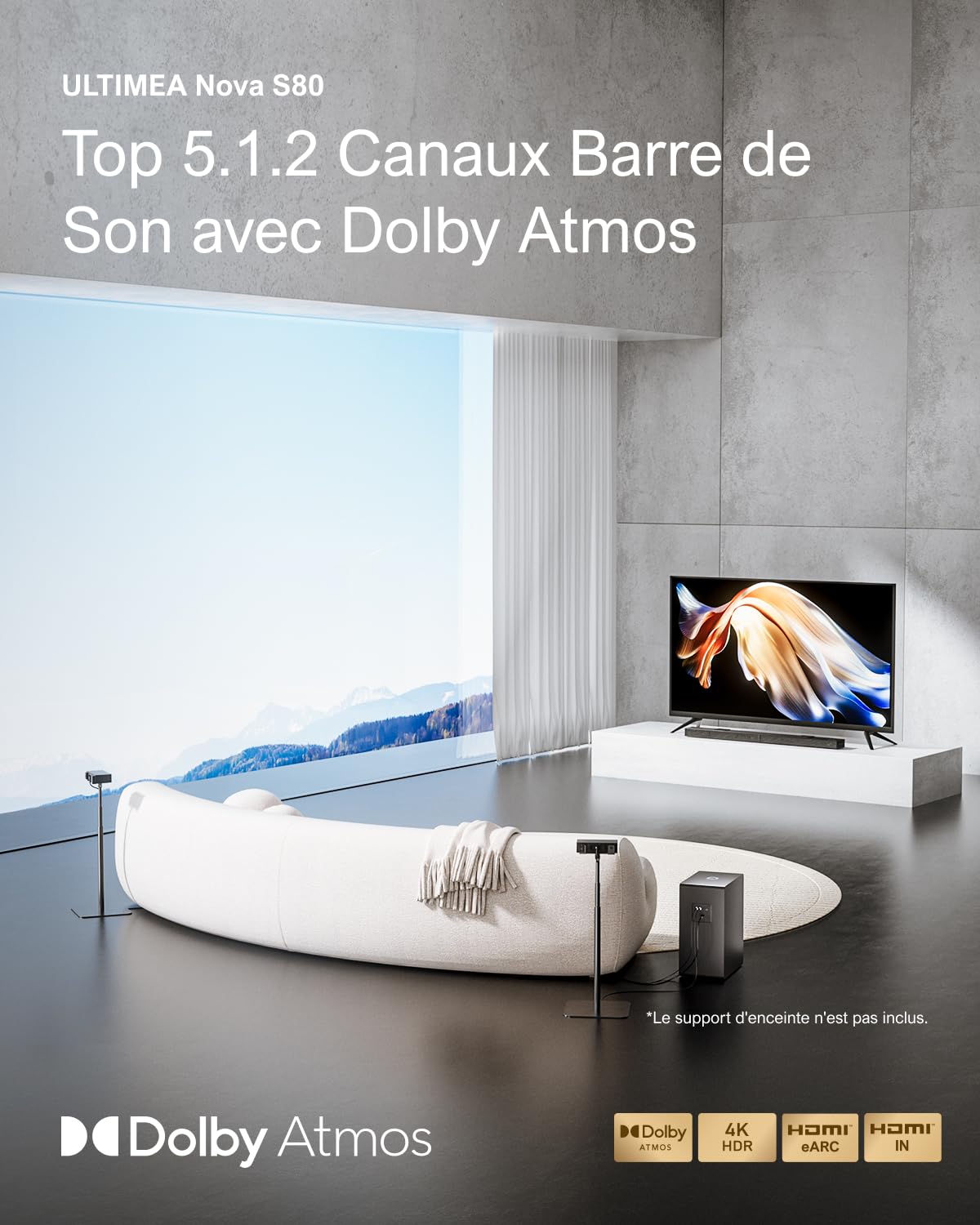 La barre de son ULTIMEA Nova S80 te plonge au cœur de l'action avec un son Dolby Atmos 5.1.2 authentique ! Elle inclut 2 haut-parleurs orientés vers le plafond pour les effets aériens, + 2 enceintes surround arrière (incluses) pour un son à 360°. Le subwoofer sans fil 8\ offre des basses puissantes. Compatible 4K HDR pour une qualité image et son top. Technologie ASL pour une localisation spatiale précise du son. Parfaite pour les films, jeux vidéo et musique. Transforme ton salon en véritable salle de cinéma !